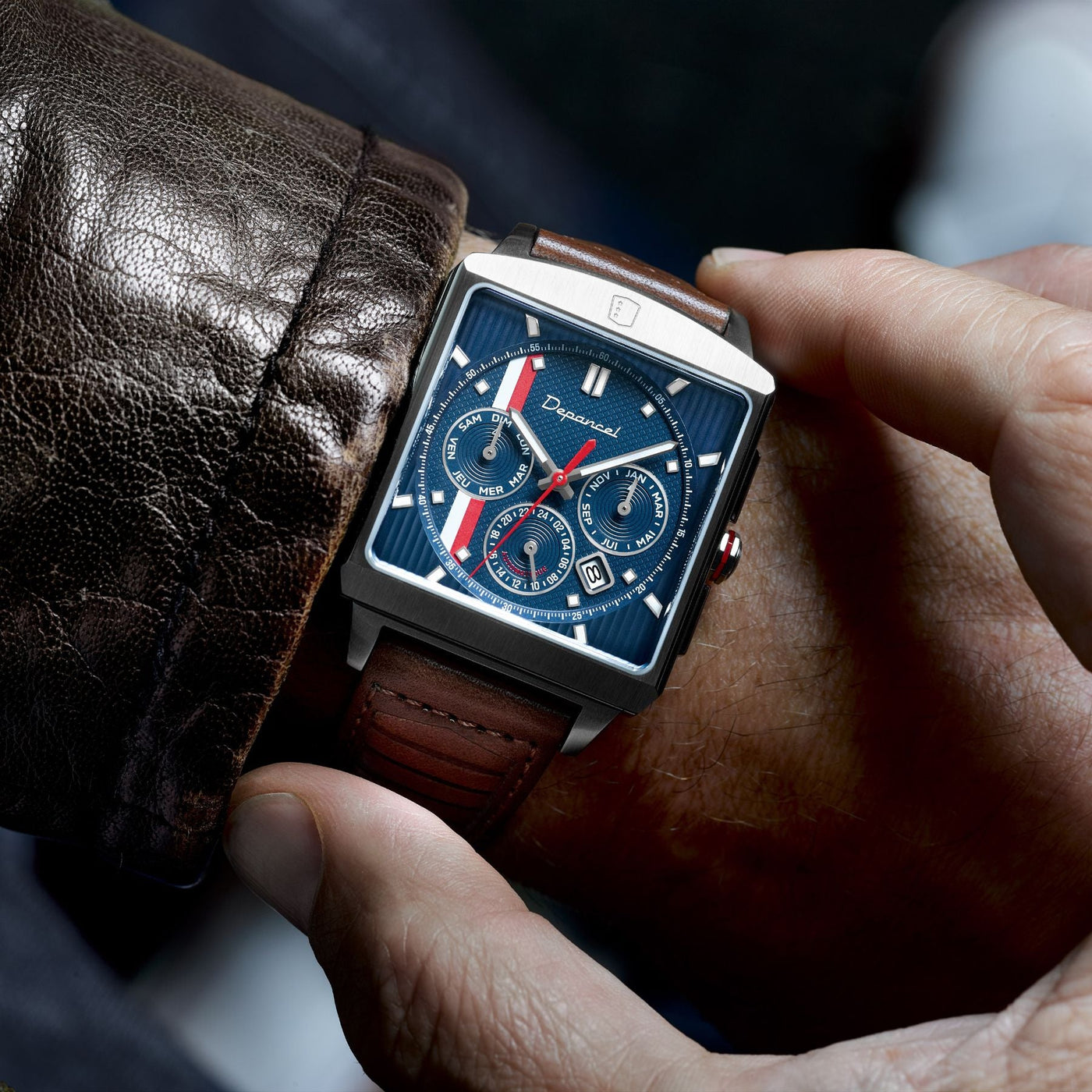 El cronógrafo es el instrumento por excelencia para medir el tiempo. Un verdadero símbolo para los amantes del automovilismo. Un reloj Depancel es un instrumento deportivo, legible, fiable y divertido con el que estarás preparado para la carrera.